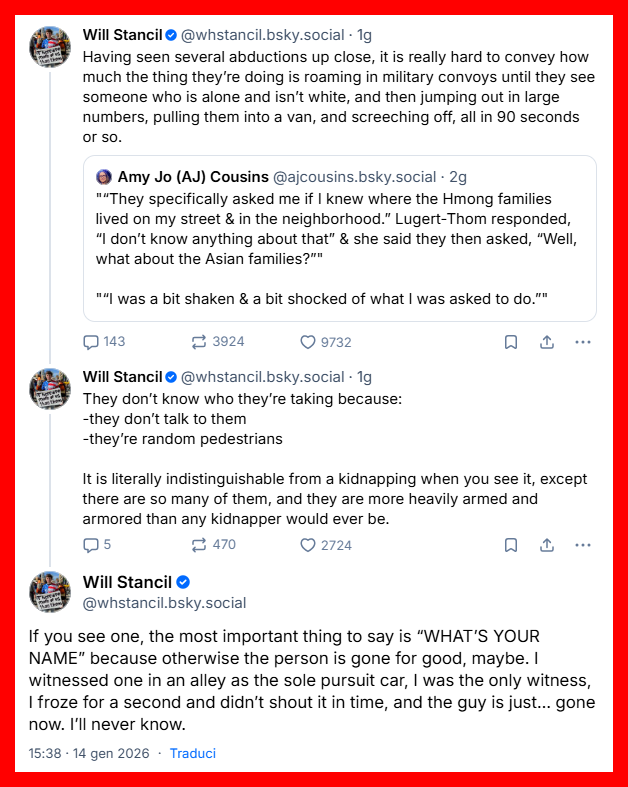 Quelli di ICE non sanno chi stanno fermando perché non fanno domande e prendono passanti scelti a caso. Quando lo vedi, è letteralmente indistinguibile da un rapimento, se non per il fatto che sono così tanti e che sono armati e corazzati molto più di un qualsiasi rapitore.