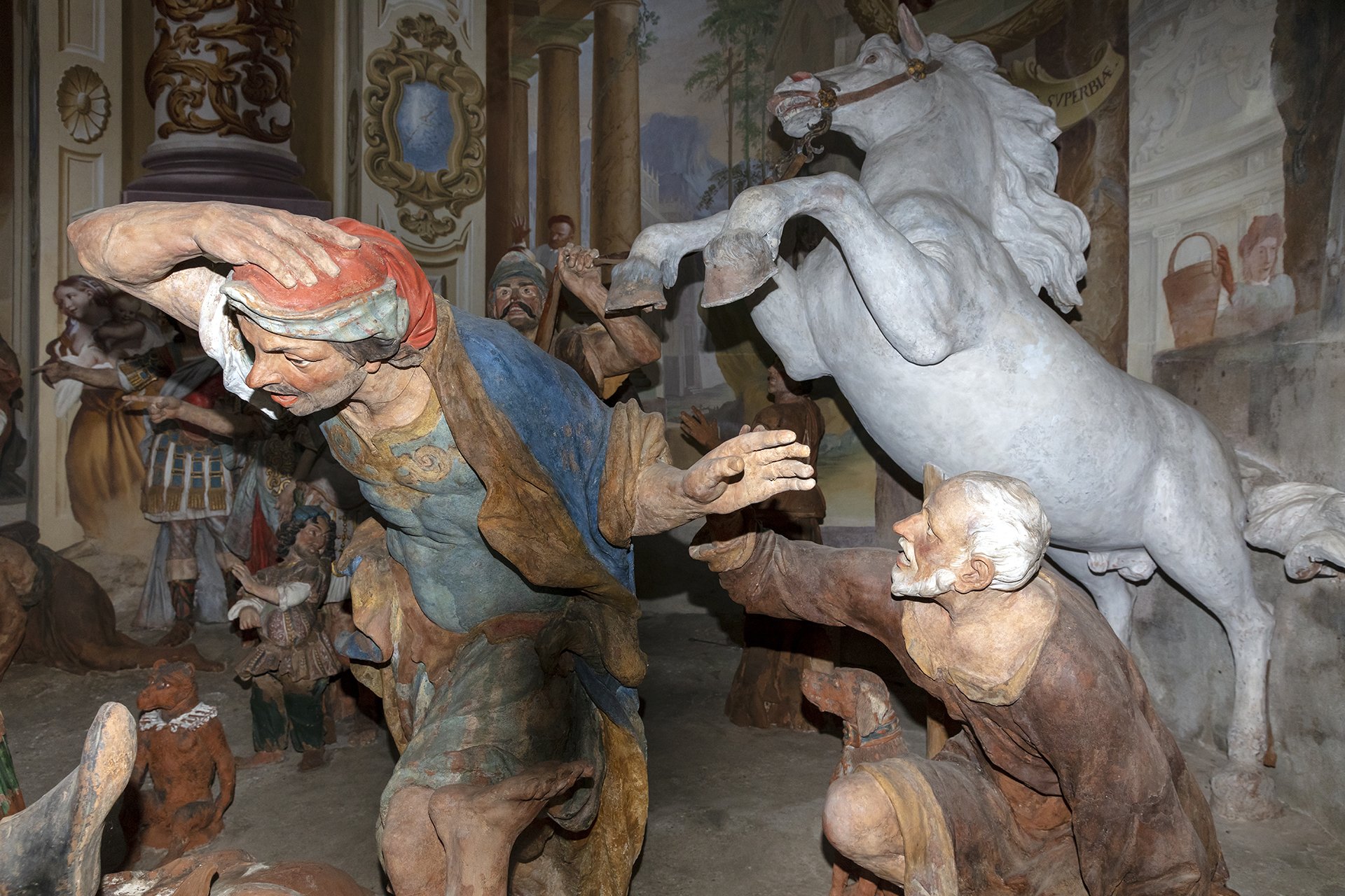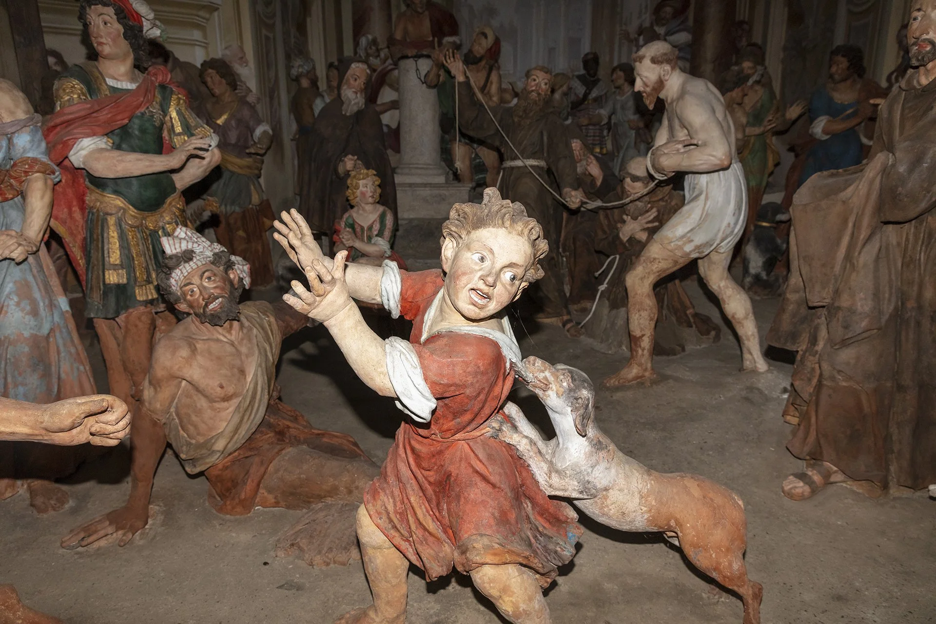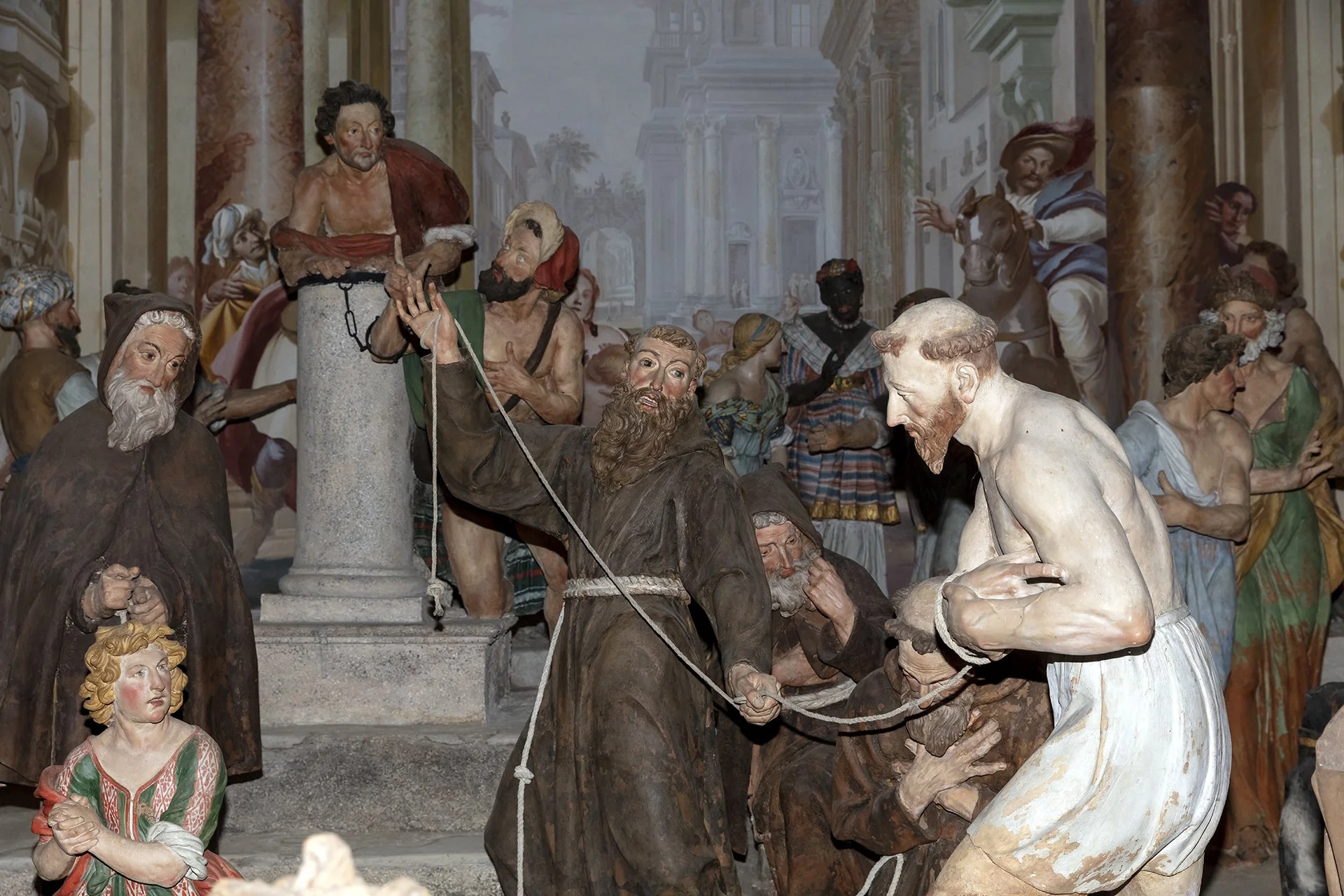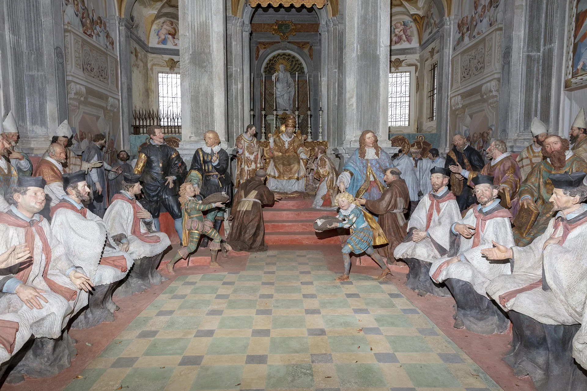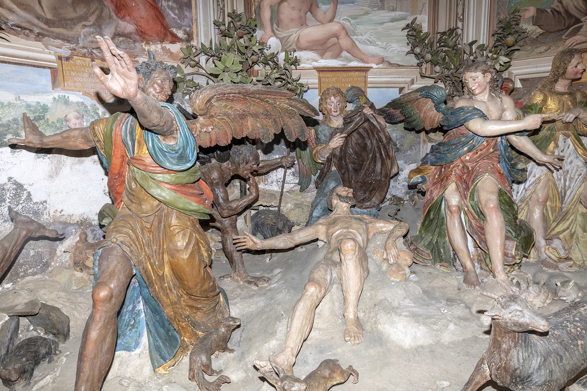 Unlike the other Sacred Mountains, the one in Orta is the only one entirely dedicated to a single saint. The 20 chapels that compose it depict episodes from the life and miracles of Saint Francis of Assisi, who is seen as embodying Christ and living out his mystical and charitable experience. In keeping with the idea common to all the Sacred Mountains—to offer a theatrical representation of events—inside the chapels there are groups of life-sized painted terracotta statues (376 in total), along with numerous frescoes depicting episodes from the saint’s life that serve as a backdrop to the sculptural groups.